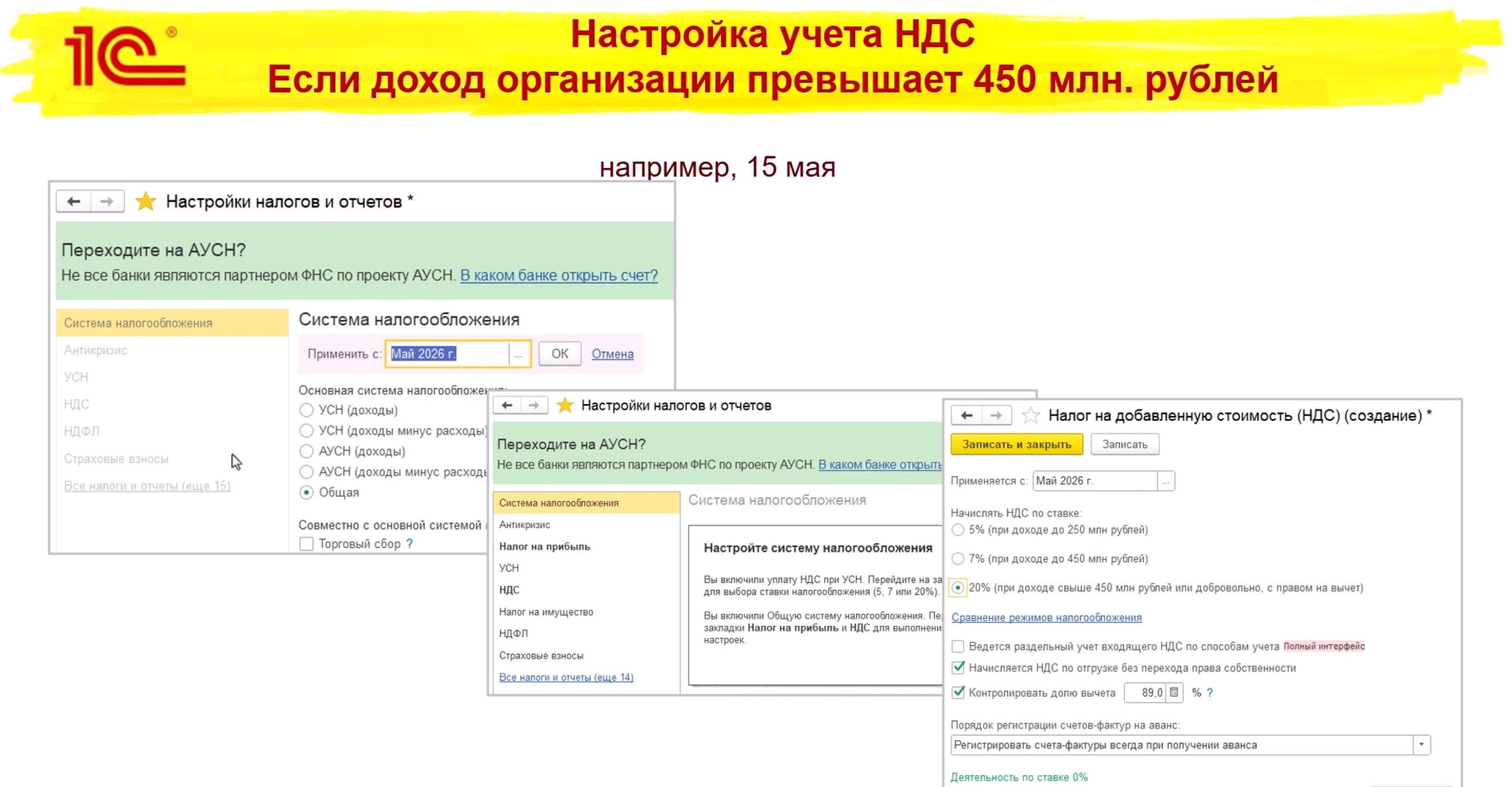 Курс создан специально для тех, кто работает на упрощённой системе налогообложения. Рассмотрены практические примеры работы для организации, которая не является плательщиком НДС, а затем переходит на исчисление и уплату НДС.